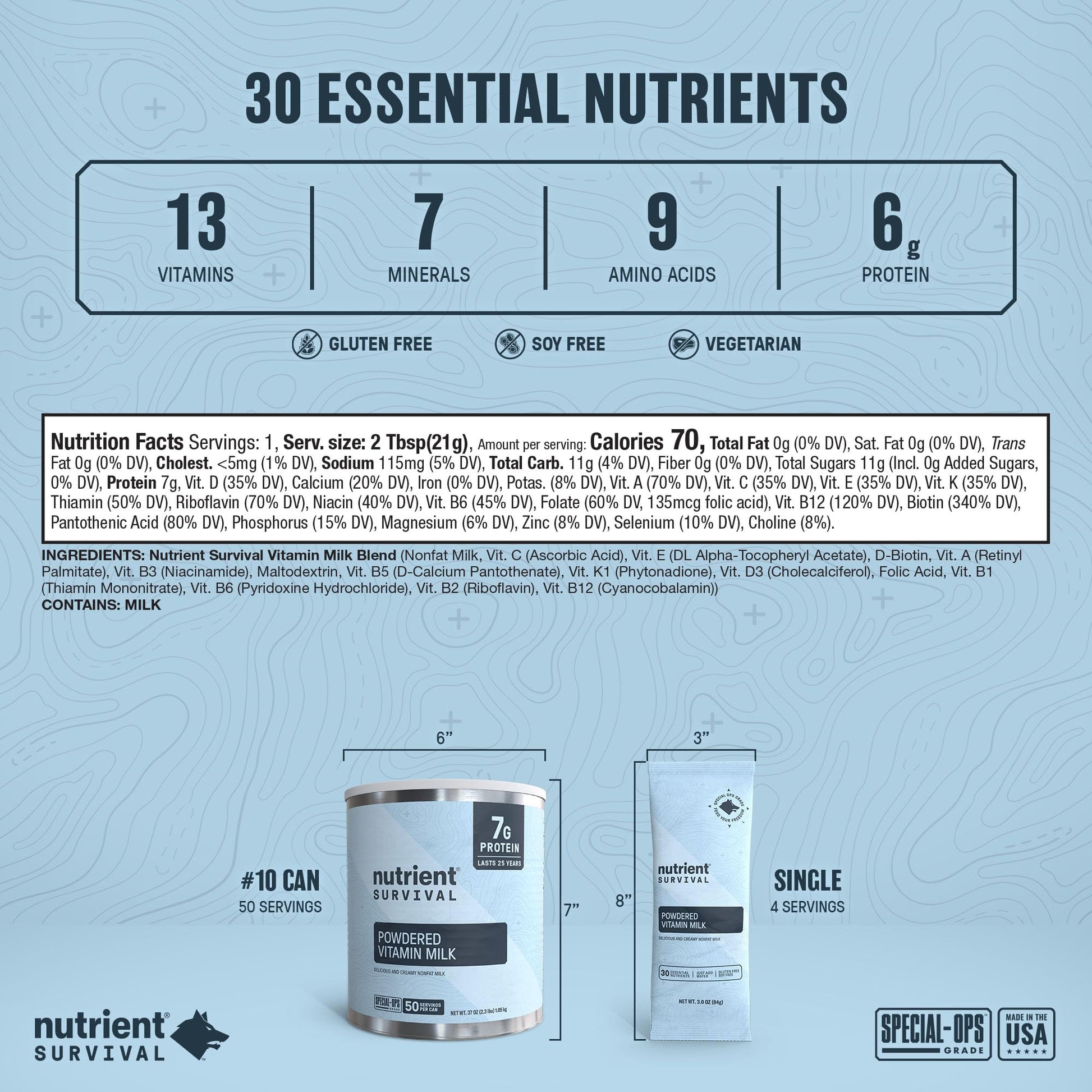- SPECIAL OPS GRADE NUTRITION: Our soy & gluten-free non-fat dry milk powder is packed with 21 nutrients in each serving. The powdered milk includes 13 essential vitamins, 7 minerals & 6g protein and is a staple survival food for every prepper’s pantry